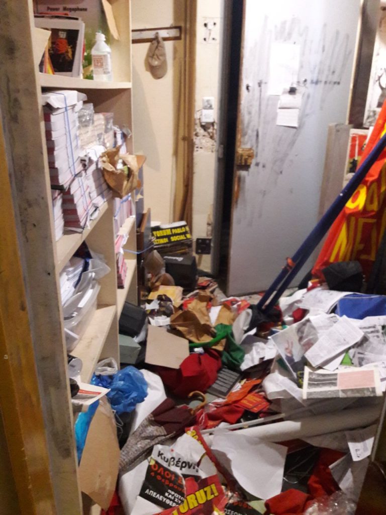 Gisterenochtend, 19 maart, werden rond drie uur ’s nachts twee kantoren en één huis in de wijk Exarcheia binnengevallen door Griekse arrestatieteams. Ruim dertig mensen werden gearresteerd, waaronder mensen met serieuze ziektes. Inmiddels zijn een aantal van hen weer vrijgelaten. Zij die nog vastzitten worden op dit moment voorgeleid in de rechtbank. De kantoren werden gevandaliseerd: